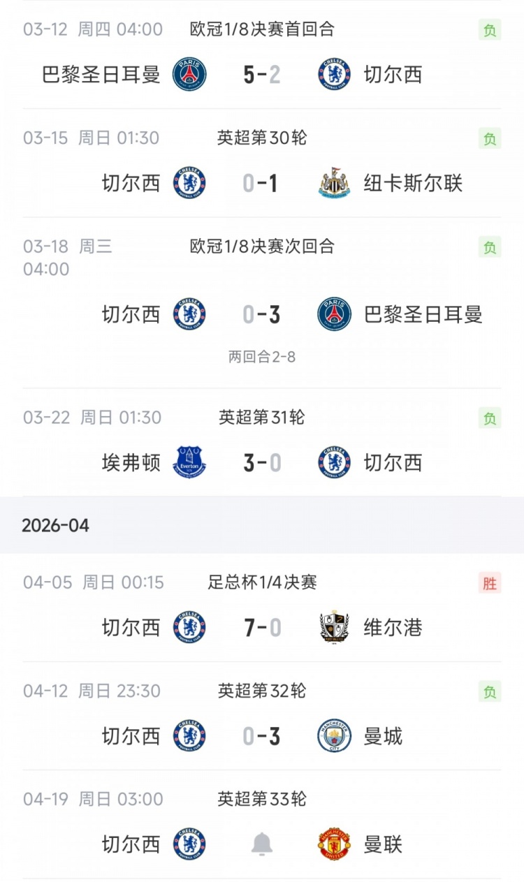 近1个月的6场比赛切尔西1胜5负,5负包含了4场惨败:切尔西2-5巴黎、0-3巴黎、0-3埃弗顿、0-3曼城,还有一场是0-1纽卡。这五场失利,导致切尔西欧冠出局,同时切尔西遭遇英超三连败,丧失争五主动权。