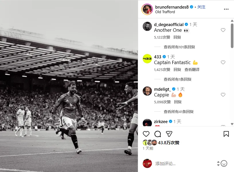赛后B费在社交媒体上晒出庆祝进球的照片,前队友德赫亚很快在评论区留言写道:“Another one(又一场胜利)”,并配上了“眼睛”表情符号,似乎对曼联未来的表现充满期待。
